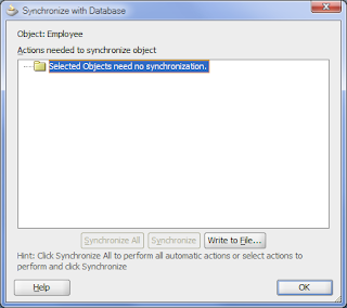 Selecting to synchronize, will bring up the Synchronize with Database dialog where the actions that require synchronization, if any, will be displayed. For the HR schema, the screen below indicates that there are no synchronization actions for the Employee Entity Object since no changes were done to the EMPLOYEES table.
