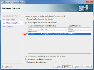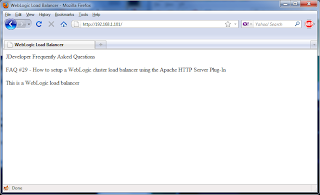 You can test the load balancer by sending the following request http://apache-host:apache-port/cluster/faces/TestLoadBalancer.jspx, for this example the IP address of the Apache server is 192.168.1.101, so the complete URL is http://192.168.1.101/cluster/faces/TestLoadBalancer.jspx. Apache recognizes the /cluster context path in the URL and forwards the request to WebLogic via the WebLogic Plug-In!